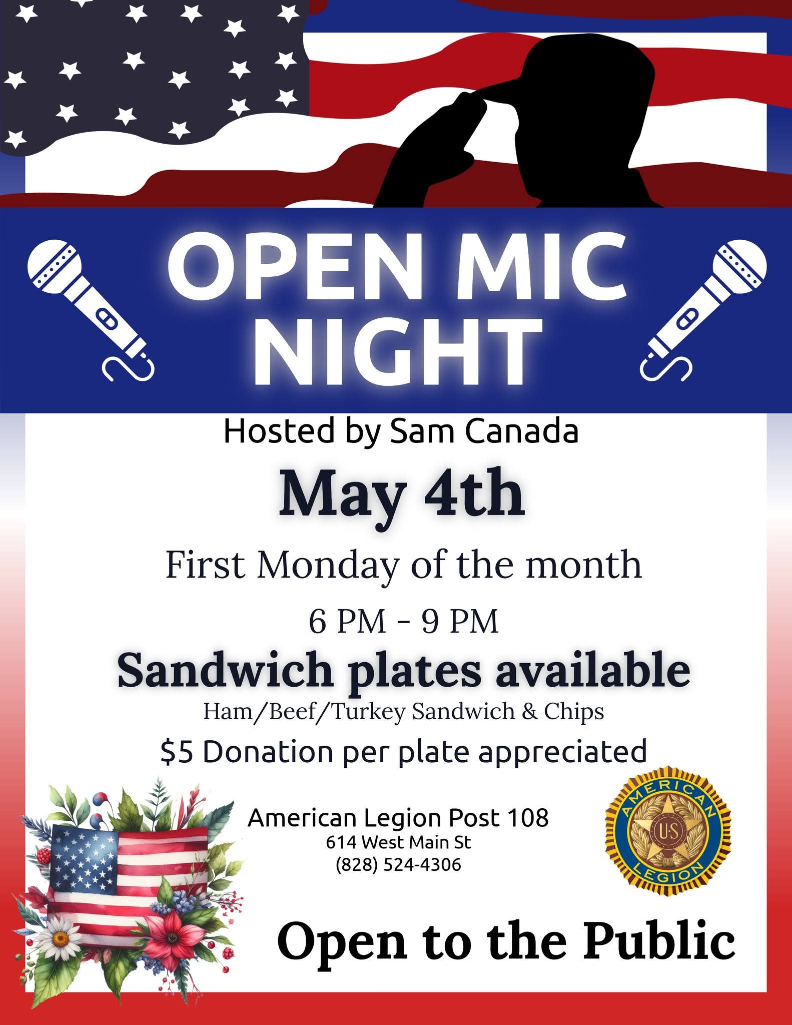 May 4 Open Mic at American Legion 6:00 pm - 9:00 pm American Legion 614 West Main Street, Franklin Event Details Get Directions